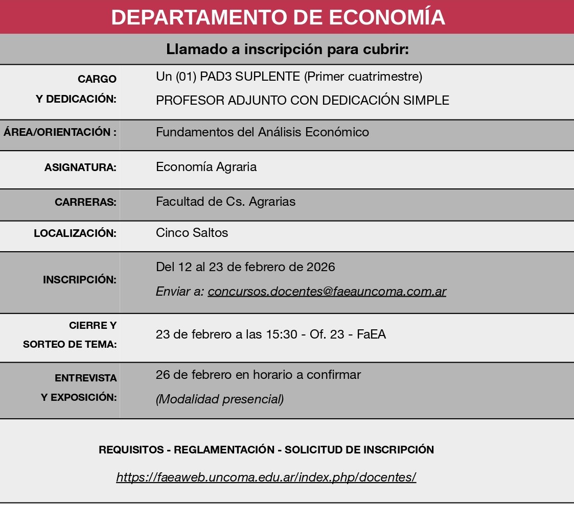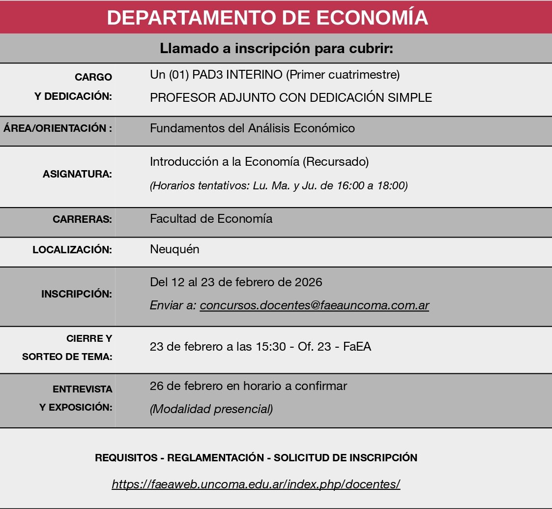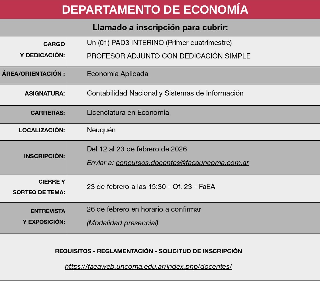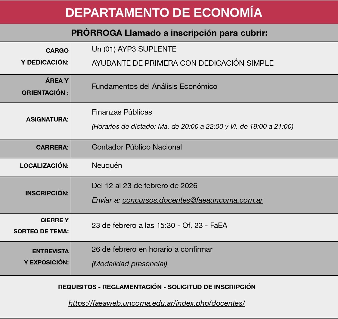 Inscripción: desde el 18 de febrero al 25 de marzo de 2026* Enviar documentación a: concursos.docentes@faeauncoma.com.ar Reglamentación y Requisitos de Inscripción: Ordenanza 728/2024 «Reglamento de Concursos Regulares para Docentes» |